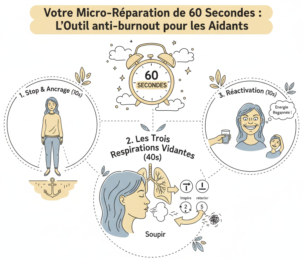 Accordez-vous des pauses : Même des micro-pauses, comme les 60 secondes que je vous propose. Ce n'est pas voler du temps à votre proche, c'est recharger vos batteries pour lui.