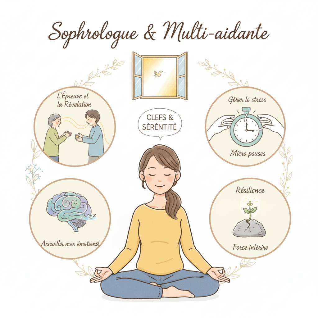 Ces expériences, aussi difficiles soient-elles, ont été pour moi une révélation. J'ai réalisé à quel point la charge mentale et émotionnelle des aidants est colossale, et à quel point il est vital de trouver des outils pour préserver son propre équilibre. C'est dans cette quête que la sophrologie est entrée dans ma vie.